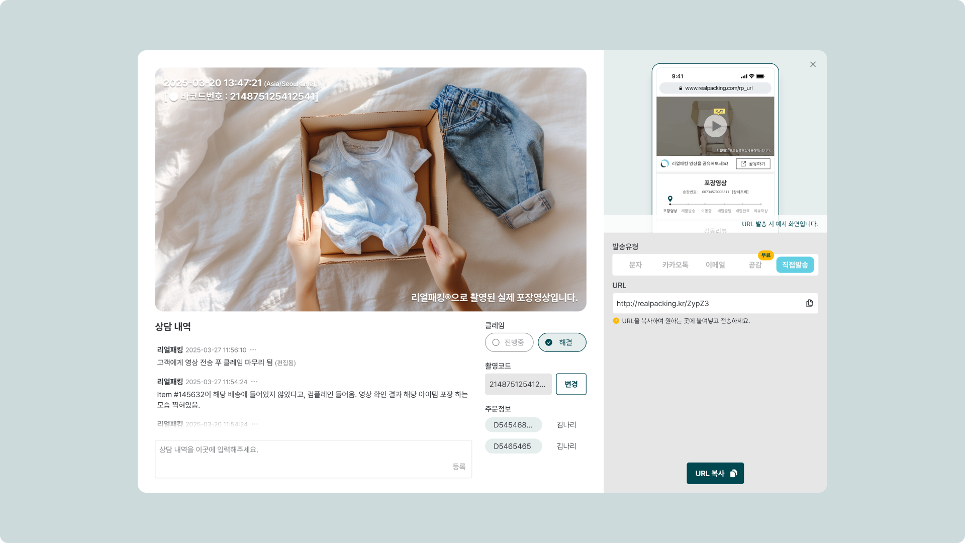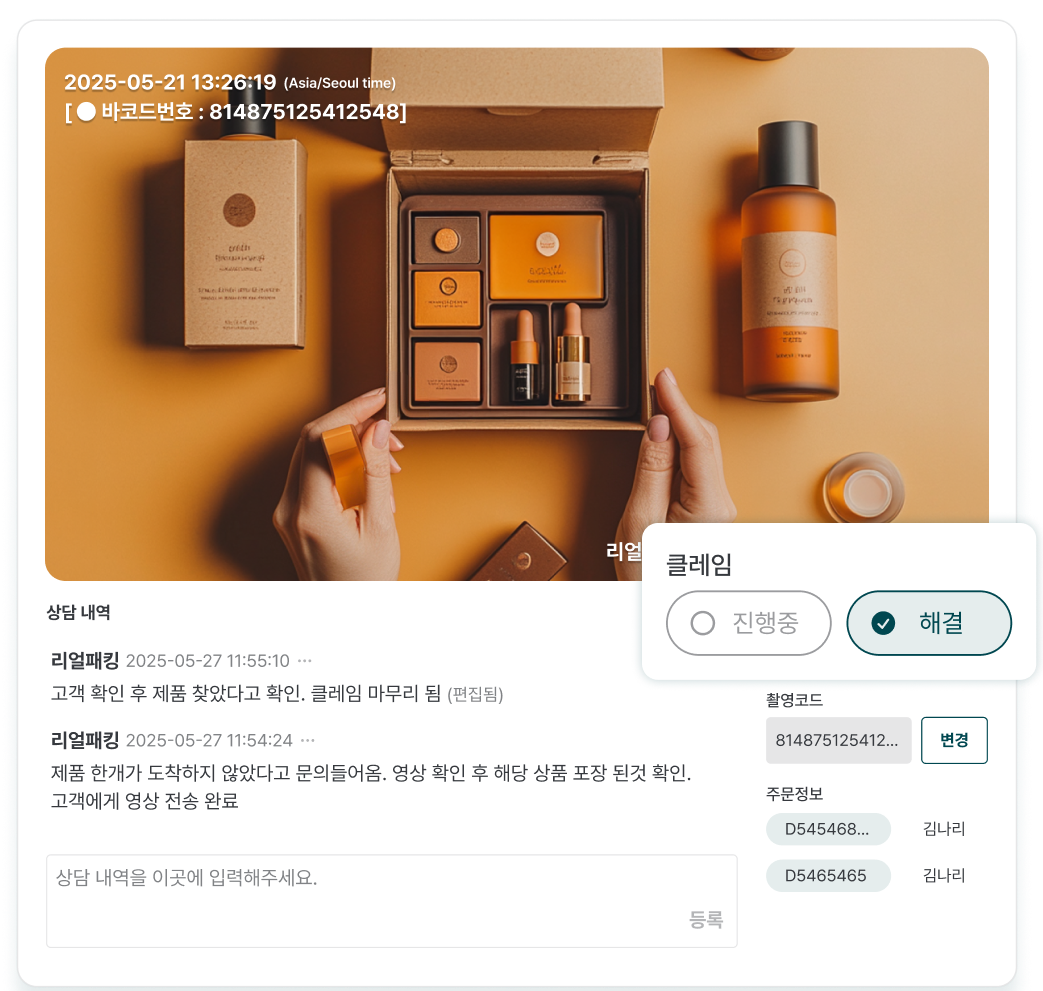 ๋ฆฌ์ผํจํน์ ์์ ๊ธฐ๋ก์ ์๋น์์๊ฒ ํ๋งคํ ์ ํ์ ์ถ๊ณ ๋น์ ์ํ์ ํฌ์ฅ ๊ณผ์ ์ ๊ธฐ๋กํ ์ ์์ต๋๋ค. ์ด ์์์ ์ด๋ฉ์ผ์ด๋ ๋ฉ์์ง๋ก ๊ฐํธํ๊ฒ ๊ณต์ ํ๋ฉด, ๊ณ ๊ฐ๋ ์ํฉ์ ๋น ๋ฅด๊ฒ ์ดํดํ ์ ์์ต๋๋ค. ๋ถํ์ํ ๊ฐ์ ์๋ชจ ์์ด ๋์ํ ์ ์๊ณ , ์ฒ๋ฆฌ ์๊ฐ๊ณผ ๋น์ฉ์ ์ค์ฌ ์ด์์ ์์ ์ฑ์ ๋์ผ ์ ์์ต๋๋ค.