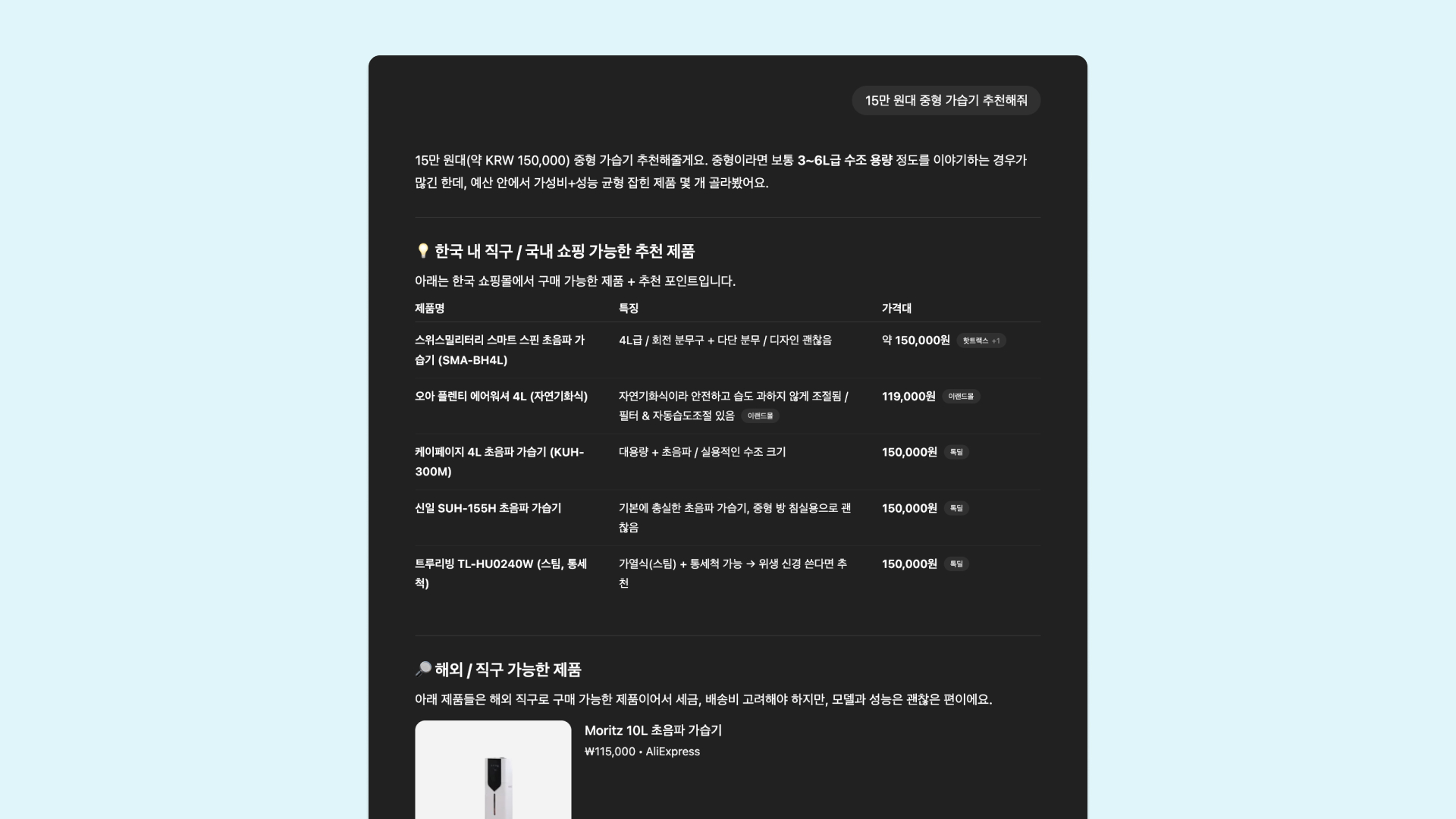๋๋ค. ์ฌ์ฉ์๊ฐ โ15๋ง ์๋ ์คํ ๊ฐ์ต๊ธฐ๋ฅผ ์ถ์ฒํด์คโ๋ผ๊ณ ๋งํ๋ฉด, AI๋ ๊ด๋ จ ์ ๋ณด์ ๋ฆฌ๋ทฐ๋ฅผ ์ฝ์ด ์ฅ๋จ์ ์ ๋น๊ตํ๊ณ , ๋ช ๊ฐ์ง ํ๋ณด๋ฅผ ์ ๋ฆฌํด ์ ์ํฉ๋๋ค.